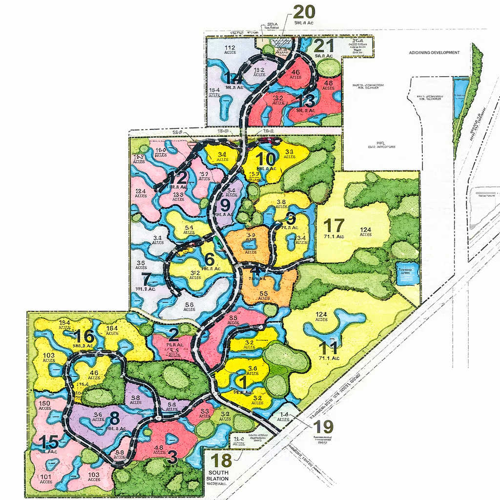 Provences was planned as a major mixed-use, master-planned community spanning 733 acres just North of another property developed by the Principals, North Pointe. Positioned at the Interstate 95 and Midway Road interchange in Port St. Lucie, Florida, the project was designed to include approximately 3,000 residential units and 2 million square feet of commercial space. The plan envisioned a 533-acre residential area and a 200-acre commercial “urban village,” anchored by a town center with a walking promenade along a 40-acre recreational lake. It further incorporated a one million square foot medical arts campus and biotech research center, a 350-room hotel and conference center, and a multi-plex movie theater.